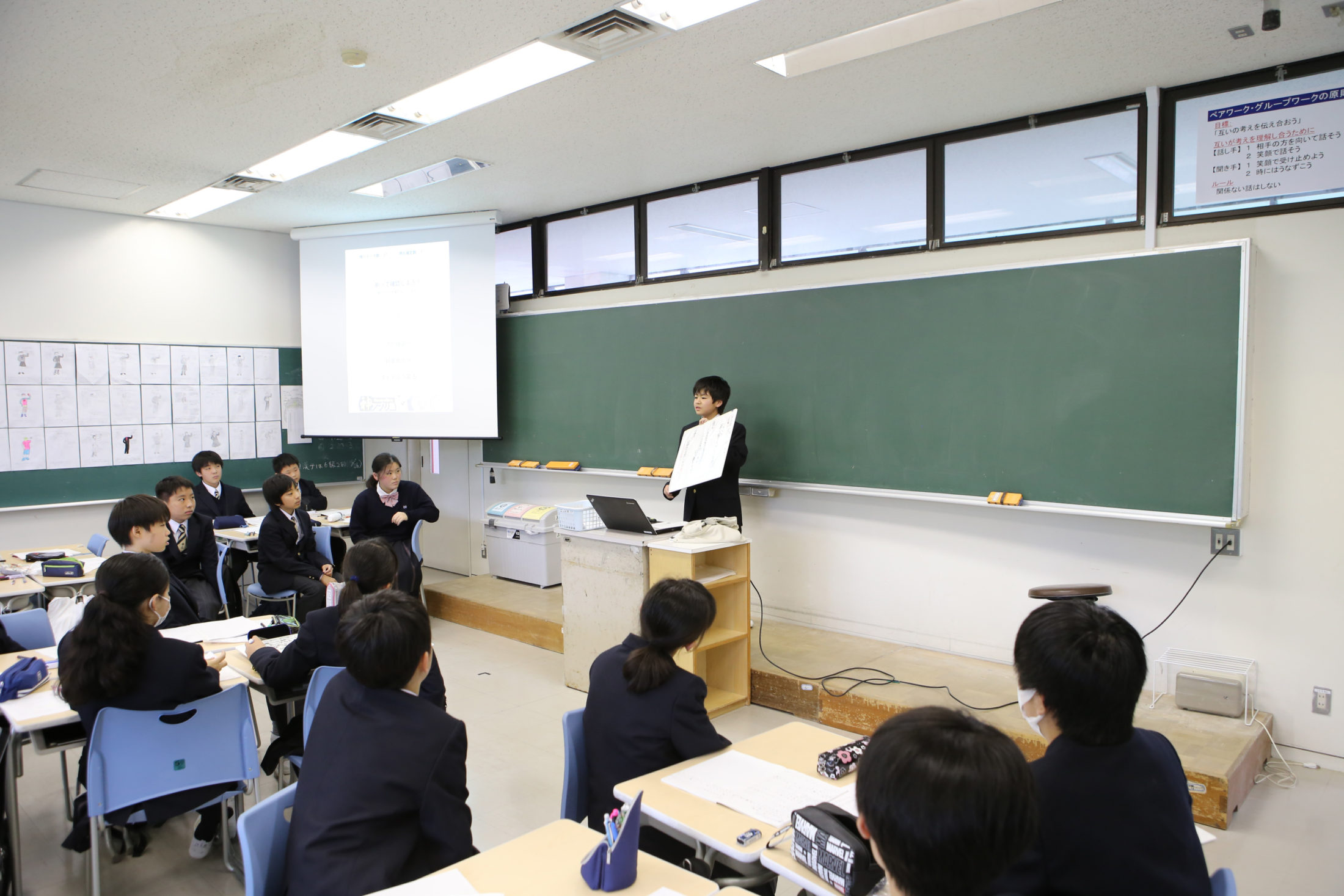 「本校のAL型授業は、例えば授業の冒頭に教師がその日の授業テーマを黒板に書き、それを生徒はノートに書き写します。つぎに、教師がそのテーマについて発問し、生徒はそれに対する自分の考えを書きます。これが『個』の作業です。次に発表などもしながら、個々の意見をクラスメイトと共有していきます。これが『協働』です。そして共有したものをまとめて最終的な自分の考えとしてふり返る『個』の作業で締めくくられます。